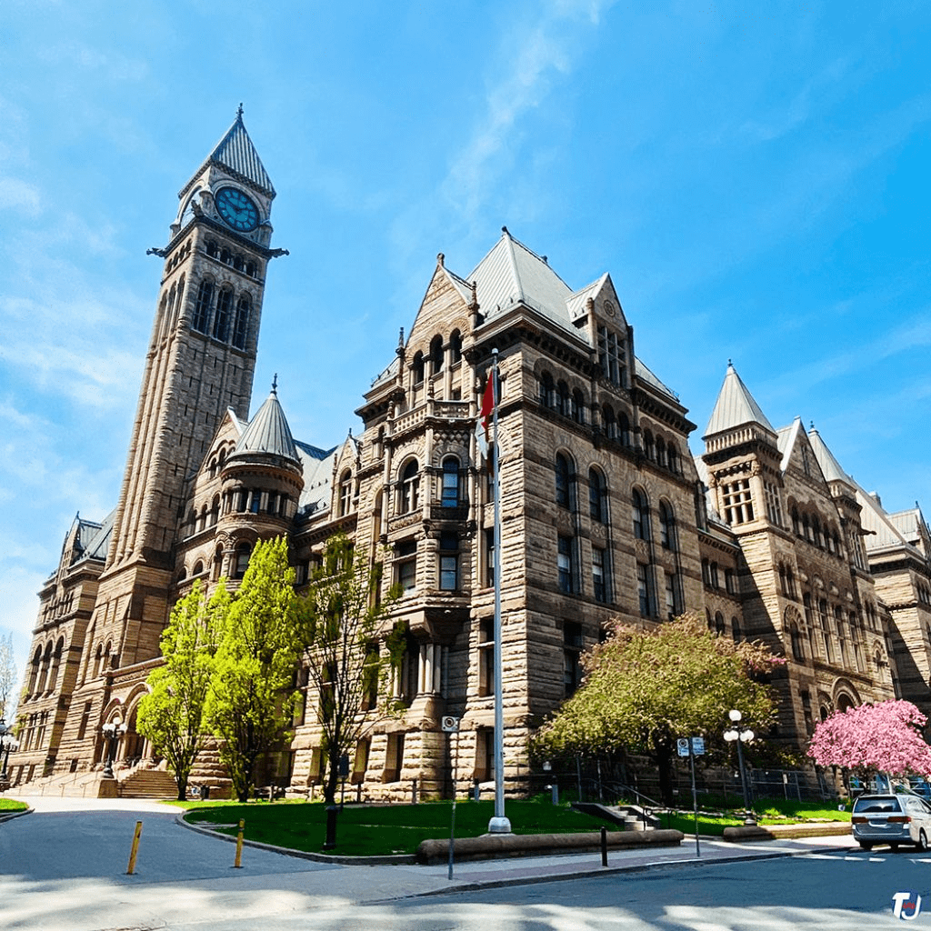 Стара ратуша Торонто, що розташована за адресою Квін-стріт, 60 (навпроти площі Натана Філіпса), є видатною спорудою та невіддільною частиною спадщини міста з 1899 року. Спочатку в ній розташовувалася міська рада Торонто, а на 2024 рік будівля функціонує як приміщення для суду Онтаріо. Також годинникова вежа Старої ратуші висотою понад 103 метри відтворює звук її дзвонів у центрі Торонто вже понад століття. Далі на torontoyes.