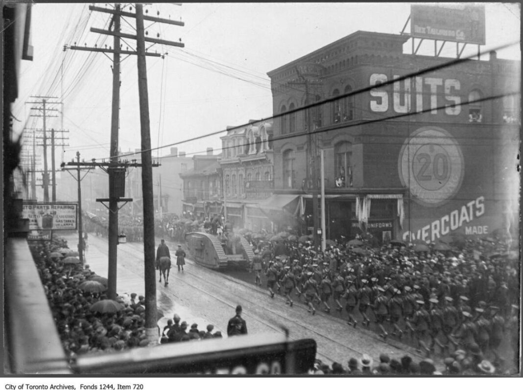 Проте Торонто допомагало не лише своїм промисловим потенціалом. Наше місто стало важливим центром для набору та підготовки військовослужбовців. Молоді чоловіки вступили до Канадських збройних сил та пішли на фронт.